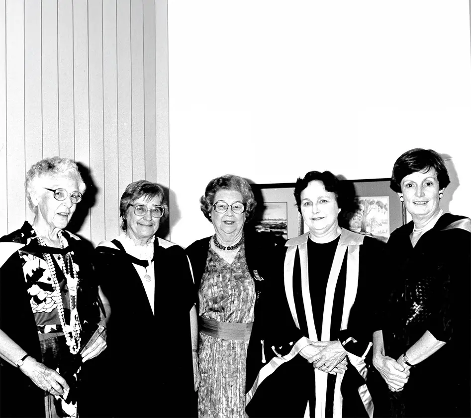 Some of the Fellows of The Women's College (left to right): Helen McBride, Jeff Sipek, alumna Judith Anderson OAM (1964 – 1966), Dr Kerry Raymond, Emeritus Professor Fred D’Agostino, and alumna Kim Lyons (2001 – 2005).