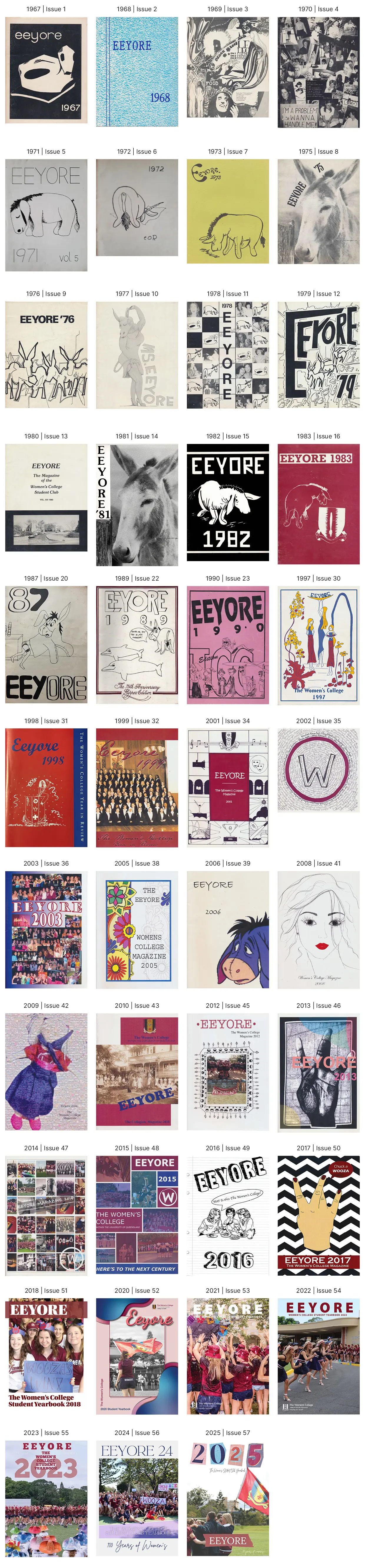 The following gallery includes covers of the copies of Eeyore that the College has in our archives. Unfortunately, we are missing a few covers! If you have a copy that is not pictured below, please send a scan of the cover to [email protected].