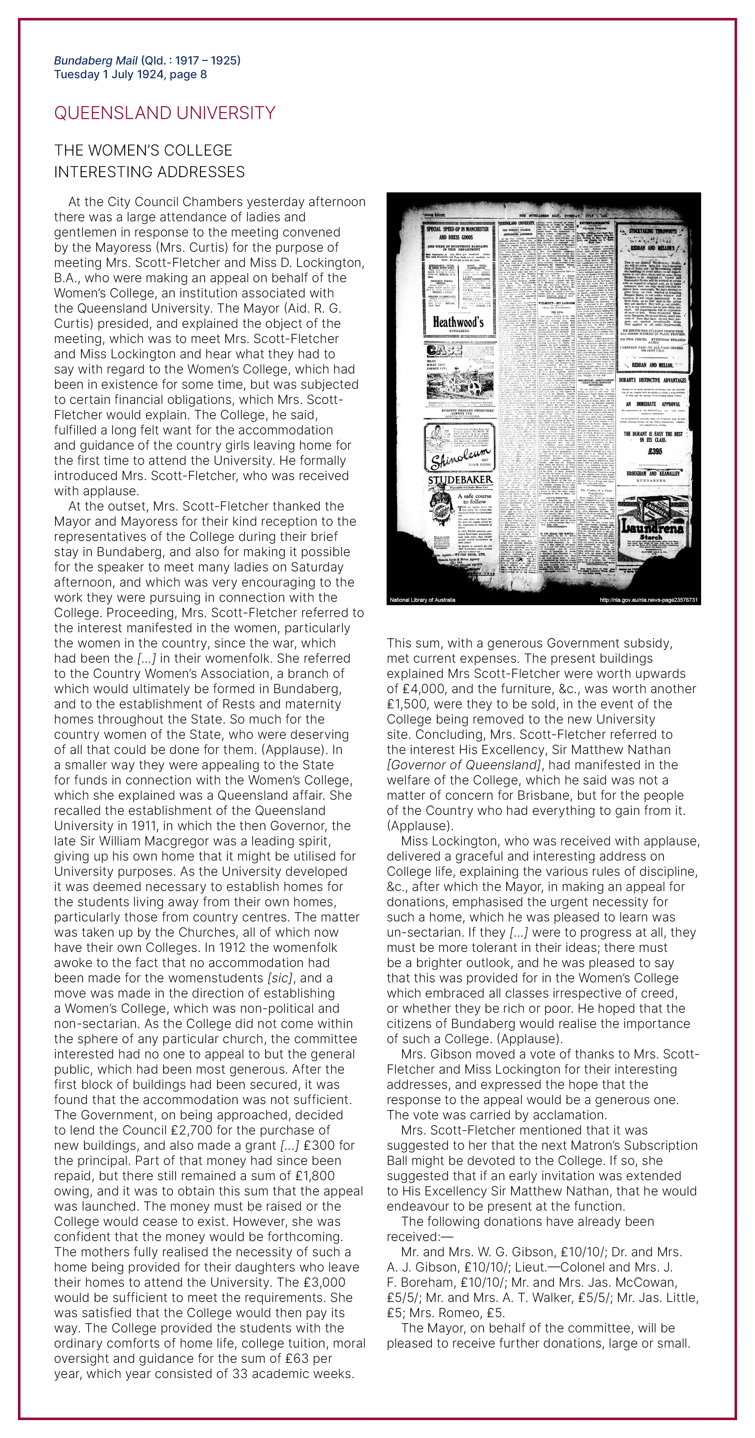 This article about The Women’s College from the Bundaberg Mail was published on Tuesday 1 July 1924. The article details the proceedings of a meeting at the City Council Chambers where dignitaries and community members spoke about the continued need to financially support The Women’s College.