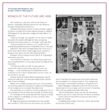 This video (no audio) shows footage from the Official Opening of The Women's College at St Lucia, which took place on Saturday 14 March 1959. The new College building at St Lucia was opened by Lady Aileen Slim, wife of the then Governor-General, alongside R. C. Cuppaidge, then President of the College Council, and several other dignitaries and representatives from the College, UQ and the State Government.