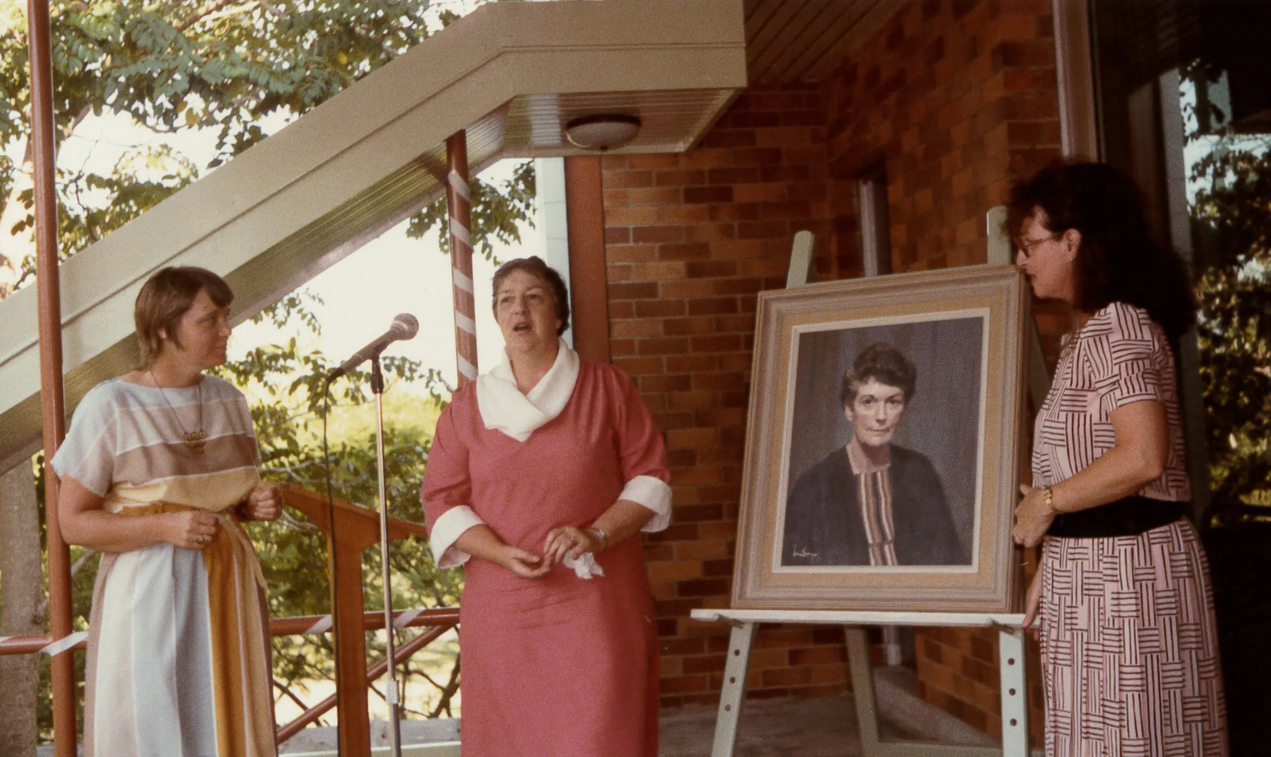 Jacqueline Bell was the College Principal from 1974 to 1984. Pictured are (left to right) President of the Old Collegians Lana Hadgraft (née Yakimoff), Chair of Council Ruth Whitmore and Principal Helen McBride at the presentation of Jacqueline Bell’s portrait, in 1986.