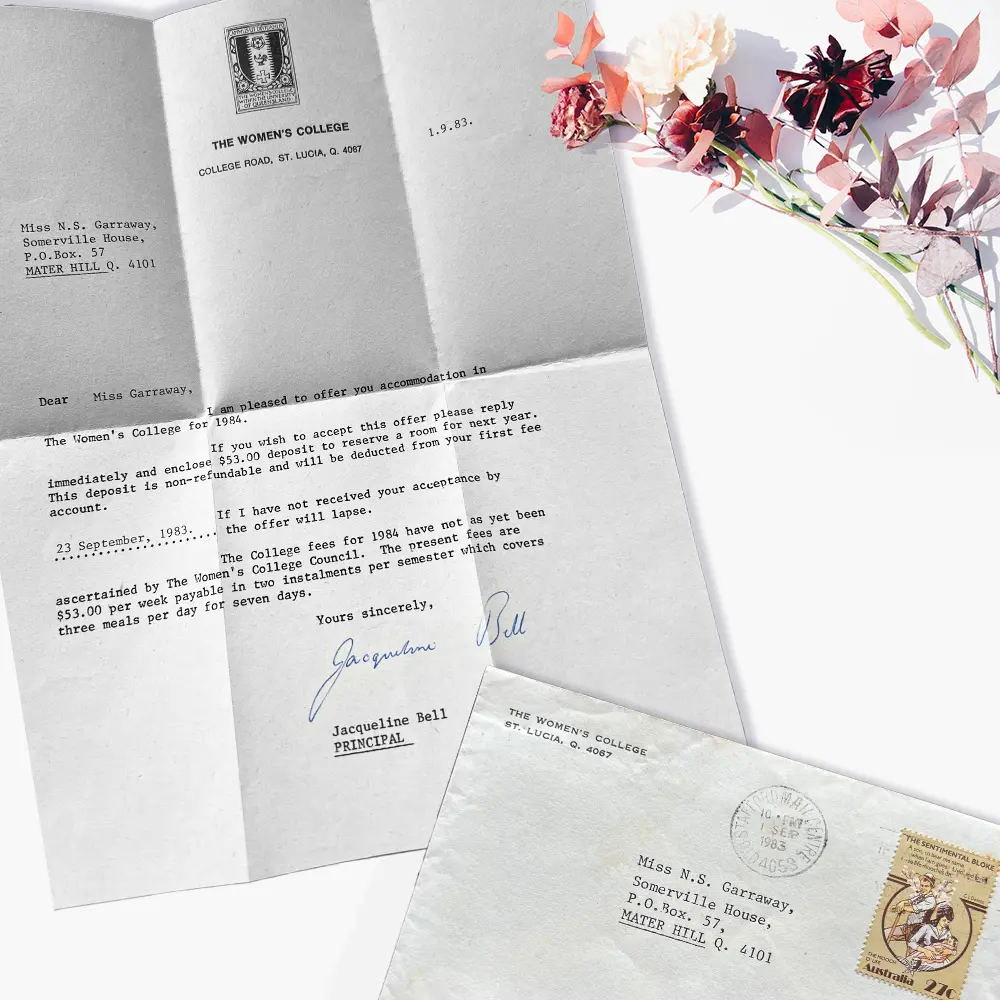 While going through some old paperwork, alumna Nadine Garraway came across the Women’s College acceptance letter she received in 1983. Complete with the original envelope in which the letter was sent, this document provides a snapshot of the College’s history. The letter is signed by Jacqueline Bell, who was the College Principal from 1974 – 1984.