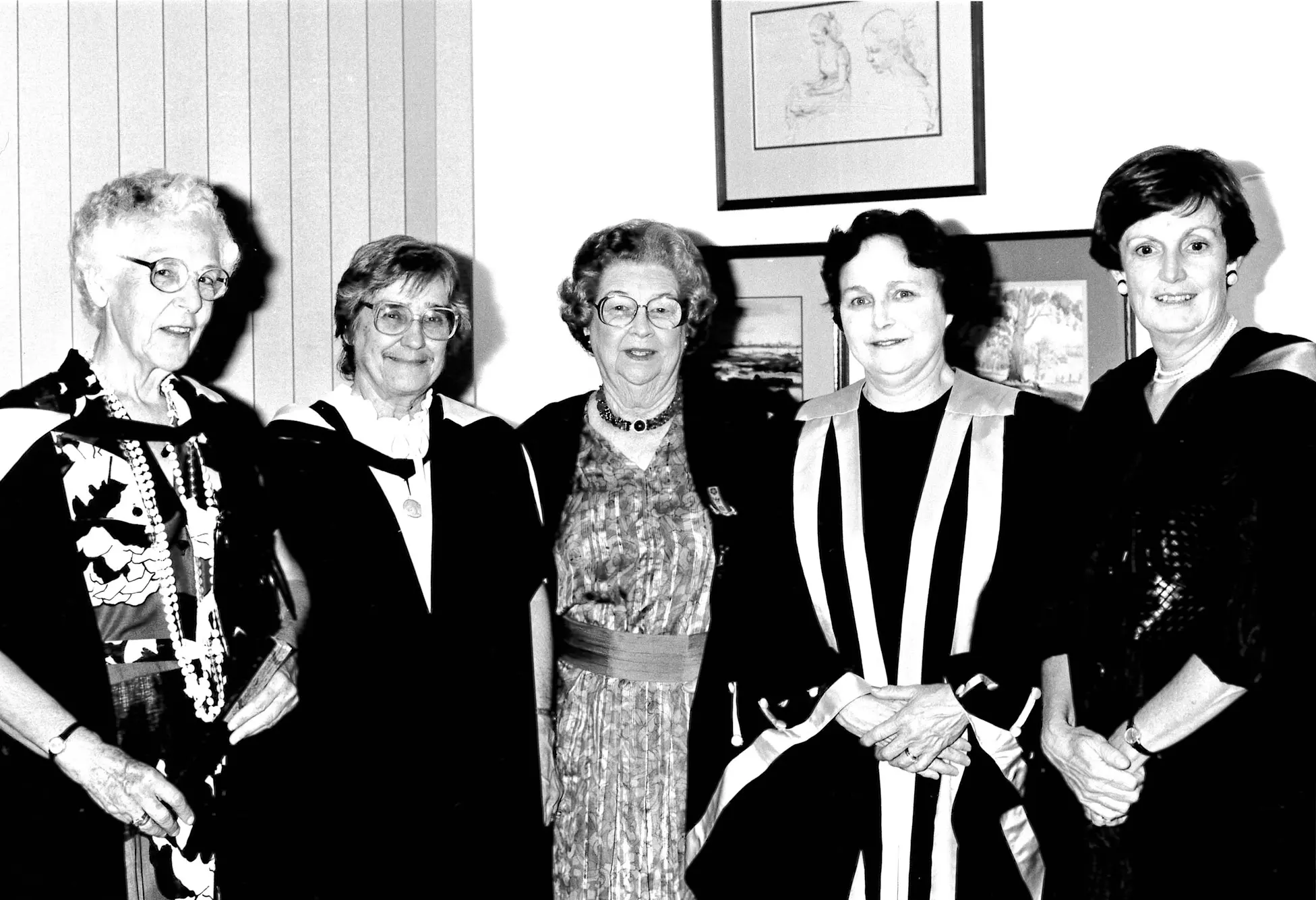 The Fellowship program at Women’s was created in celebration of the College’s 75th anniversary. The first Fellows of the College were (pictured from left to right) Suzanne Mourot, Lisbeth Hopkins (née Liddell), May Hancock, Tess Cramond (née O’Rourke-Brophy) and Jan Delpratt.
