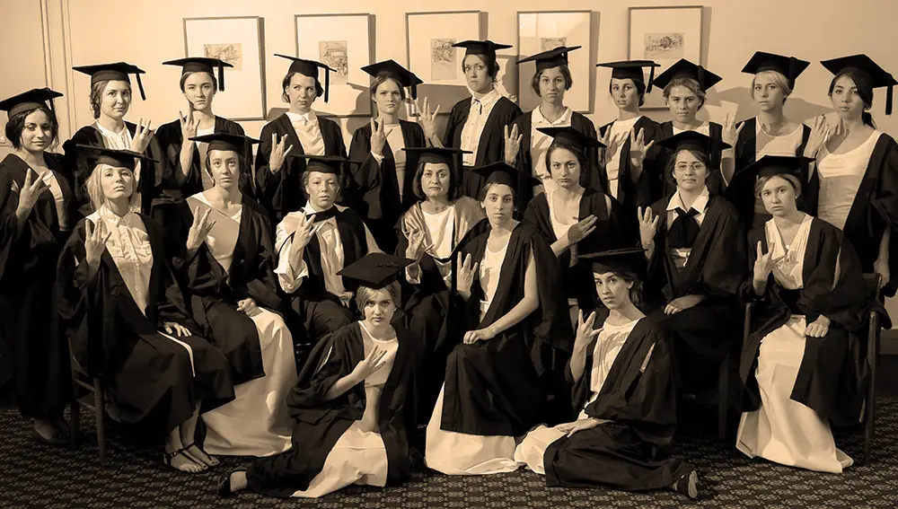 In 2013, residents and staff recreated the iconic 1914 archive photograph of the first College residents, using the Wooza hand sign as a modern twist. Head of College (2009 – 2016) Adjunct Professor Iyla Davies stood in for founding Principal Freda Bage while Dean of Students Chloe Langbroek represented Hilda Cleminson, who was a graduate student in 1914.