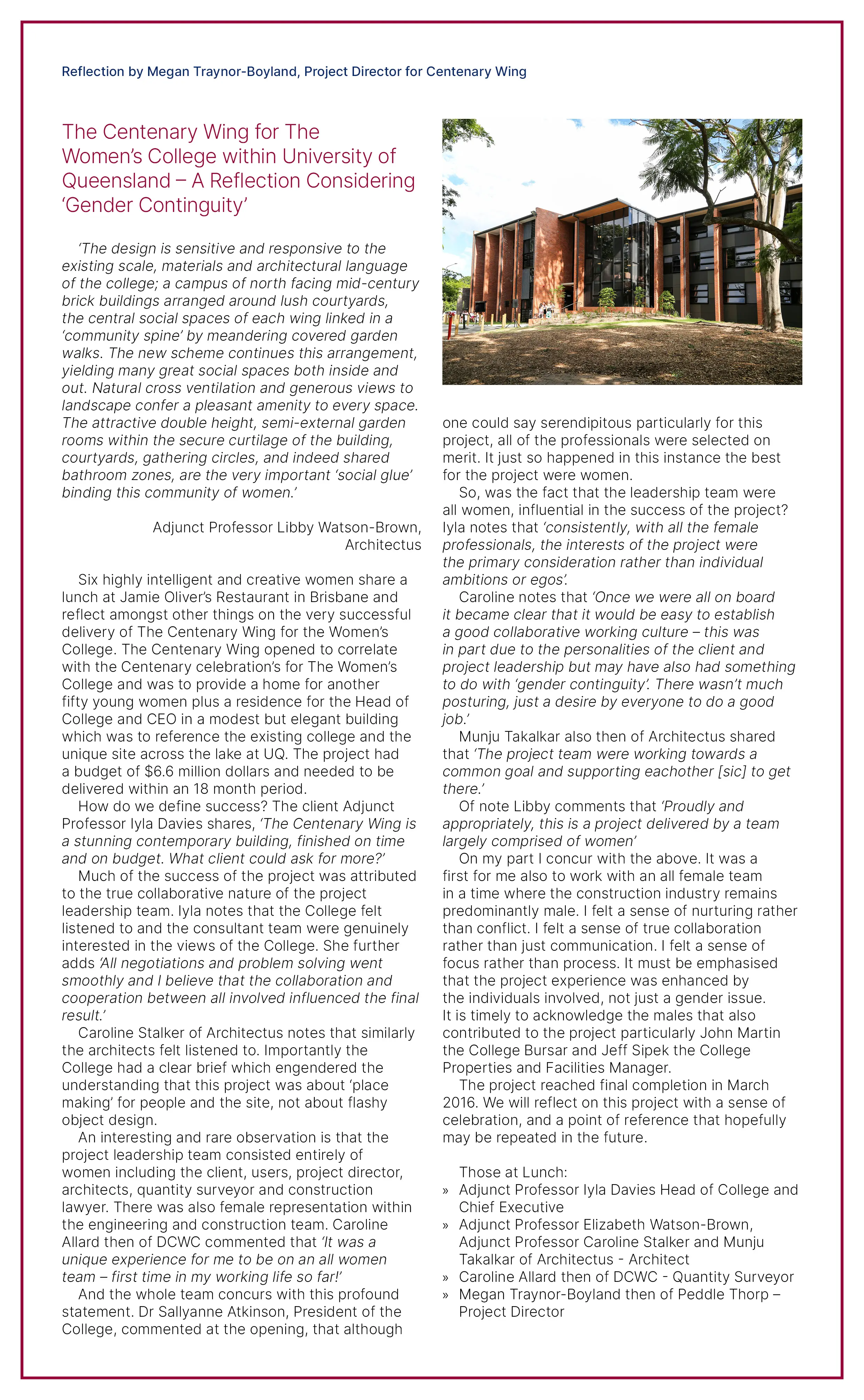The following reflection is about the design and construction of Centenary Wing and its impact on The Women’s College community, authored by Megan Traynor-Boyland, who was the Project Director for Centenary Wing.