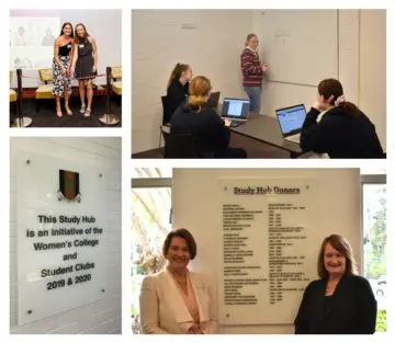 Pictured clockwise from top right: Student Club Presidents Kate Land (2019) and Ella Cooper (2020) cut the ribbon to officially open the Study Hub; residents use one of the tutorial rooms; Head of College & CEO Florence Kearney and Director of Advancement Susan McGinley with the Study Hub donor recognition plaque; and the plaque that acknowledges the contributions from the 2019 and 2020 Student Clubs.