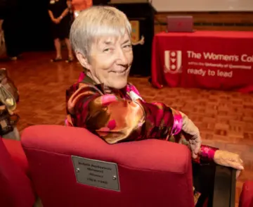 Pictured is notable alumna and Fellow of the College Judith Anderson OAM (1964 – 1966) in the chair with her named plaque.