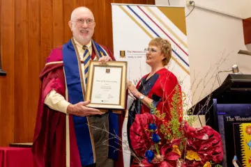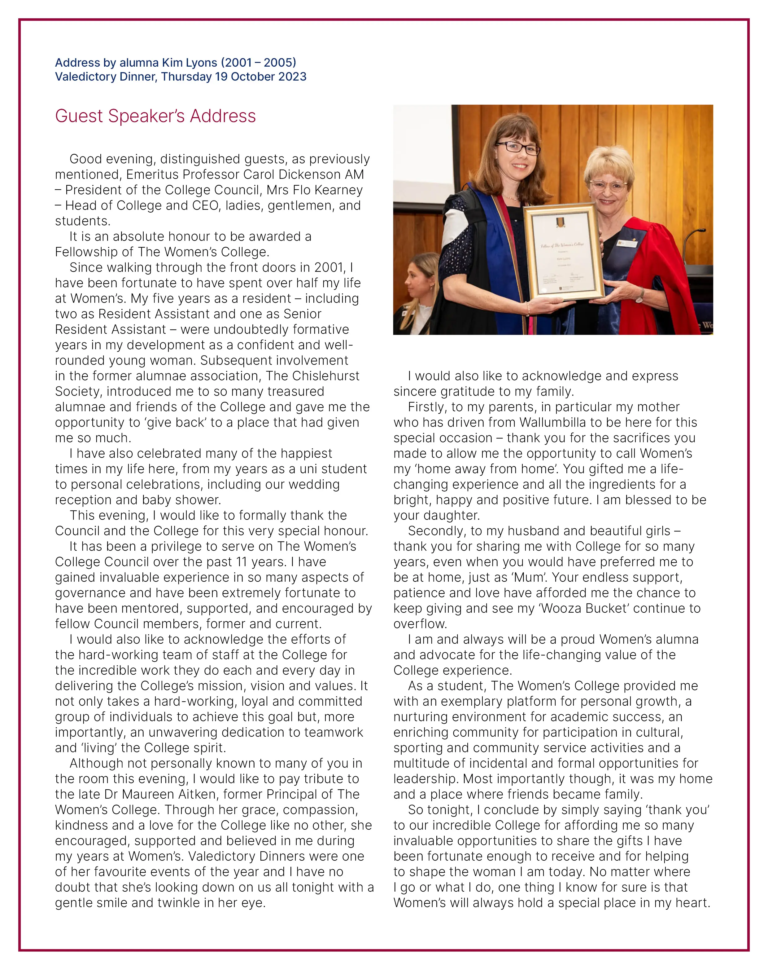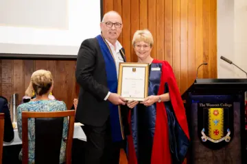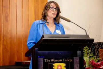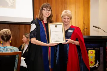 Kim Lyons (née Emery) was honoured with a Fellowship at The Women’s College Valedictory Dinner on Thursday 19 October 2023 by Council President Emeritus Professor Carol Dickenson AM (pictured).