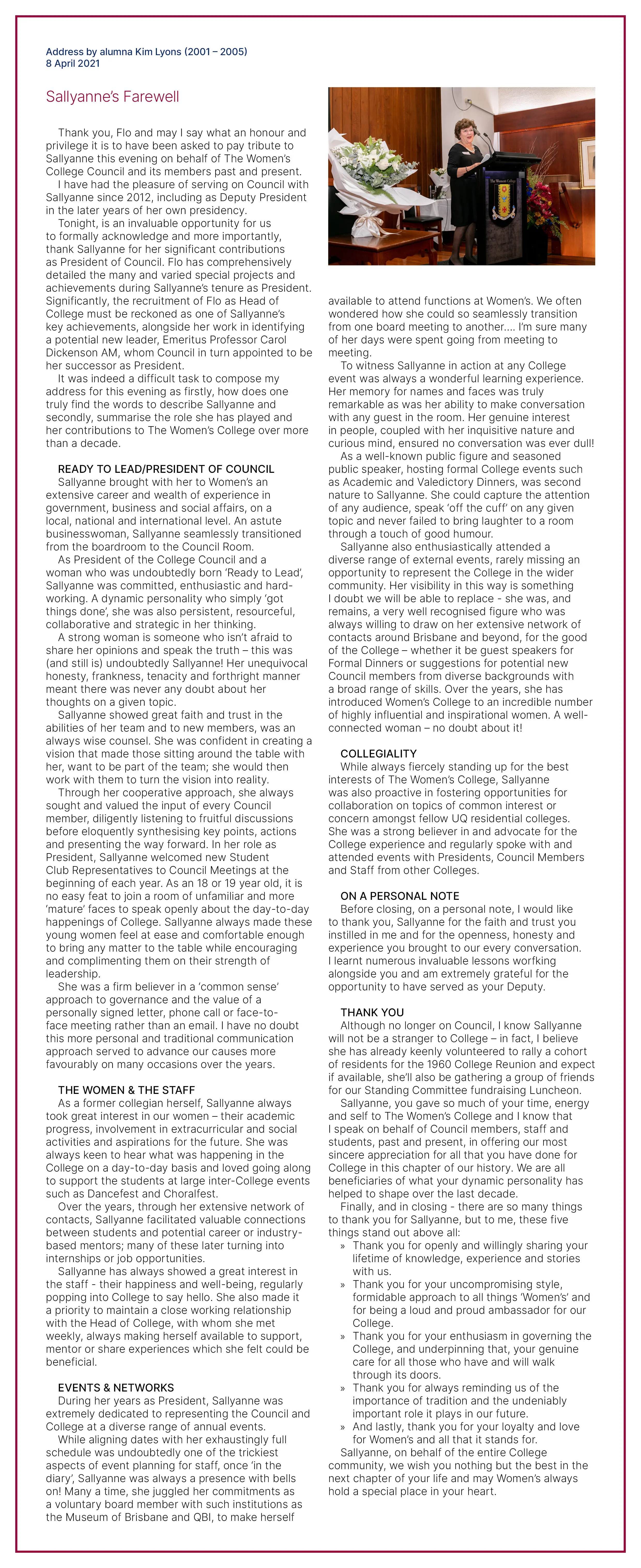 At the Reception, then Deputy President Kim Lyons delivered the following heartfelt tribute and, on behalf of the College community, thanked Sallyanne for her service to The Women’s College.