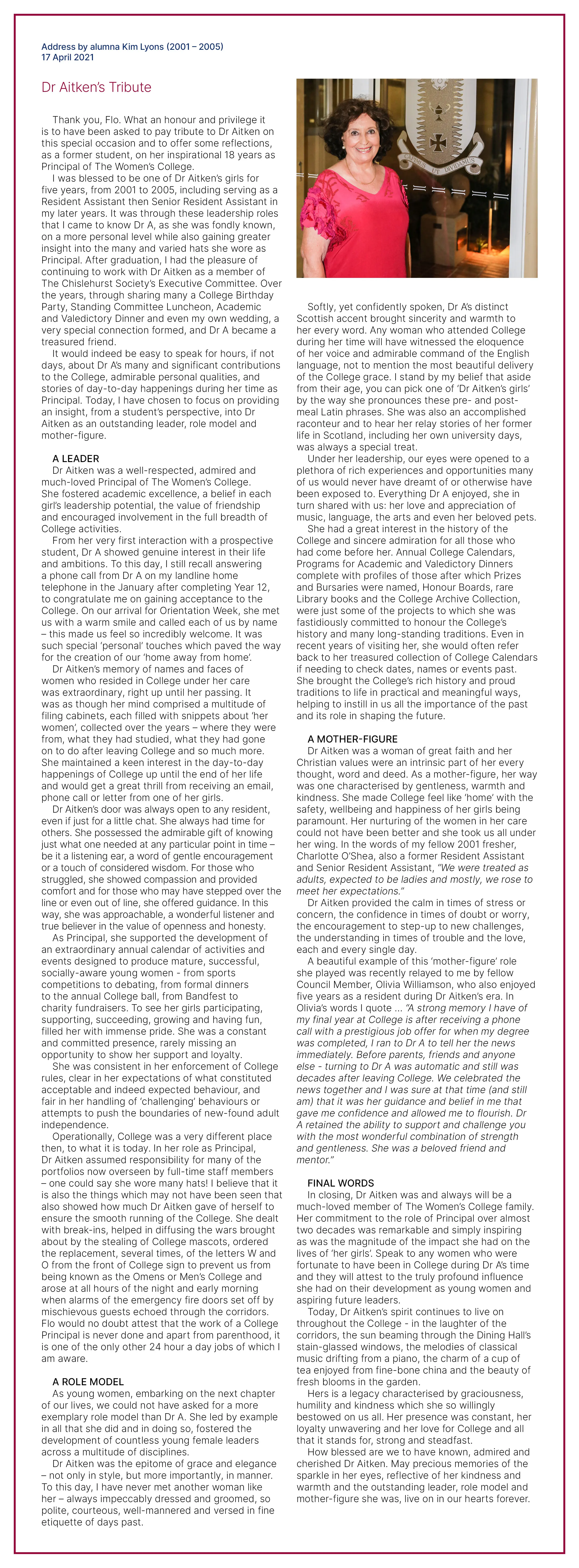 Kim Lyons (then College Council Deputy President) delivered the following tribute at the High Tea.