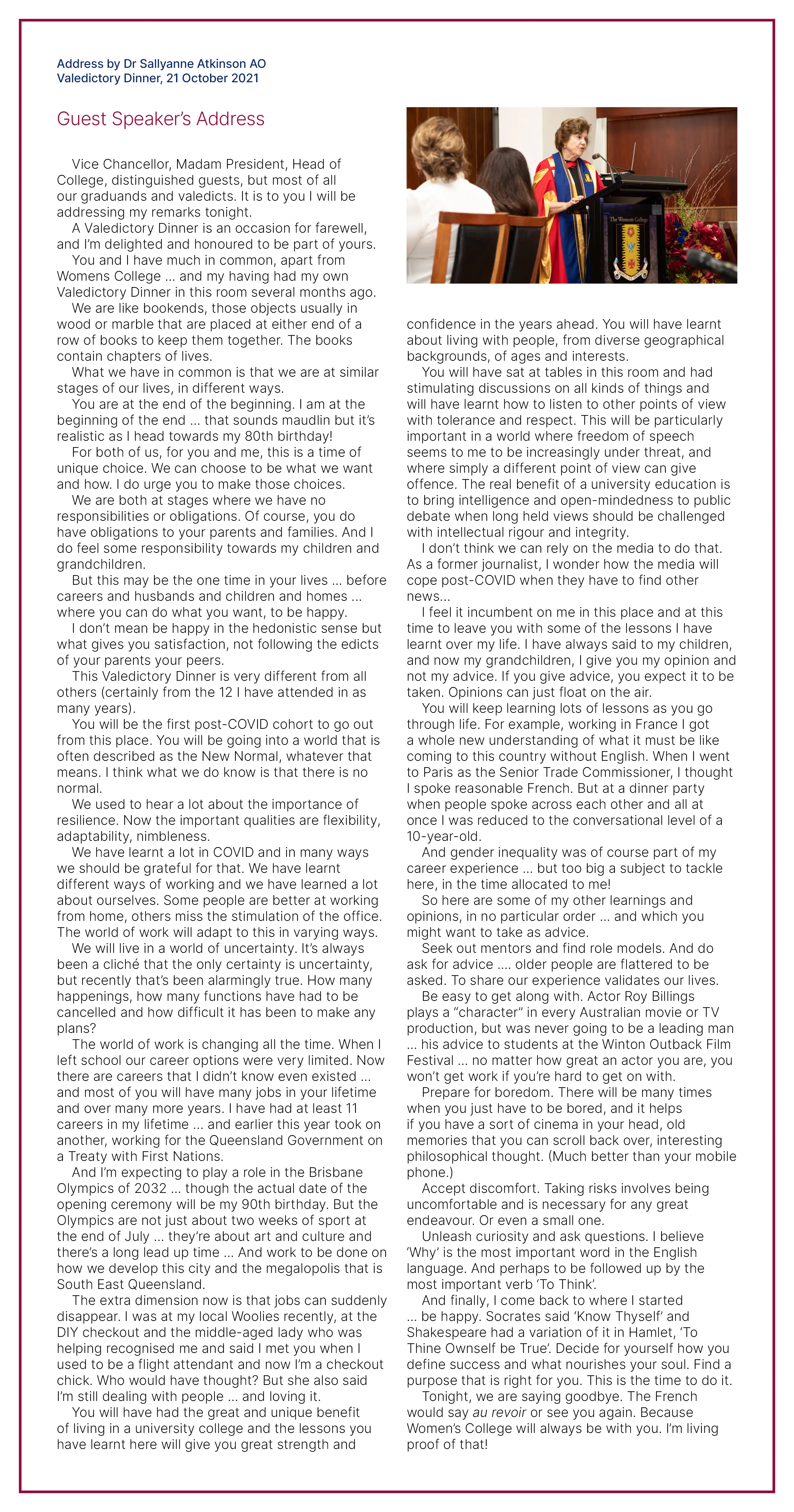 Each Valedictory Dinner features a special guest speaker. In 2021, our special guest speaker was Dr Sallyanne Atkinson AO. Dr Atkinson is an alumna of the College, a Fellow, and was the Council President from 2009 to 2020. She was also Lord Mayor of Brisbane from 1985 – 1991.