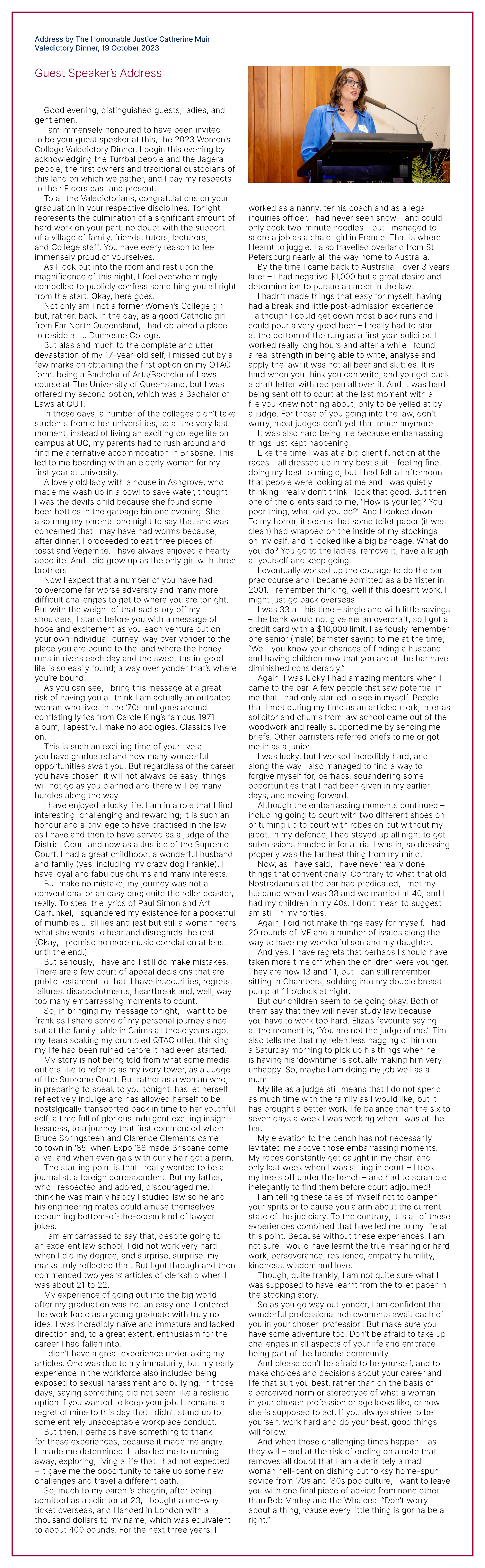 In 2023, the College was privileged to have The Honourable Justice Catherine Muir as our guest speaker at the Valedictory Dinner.