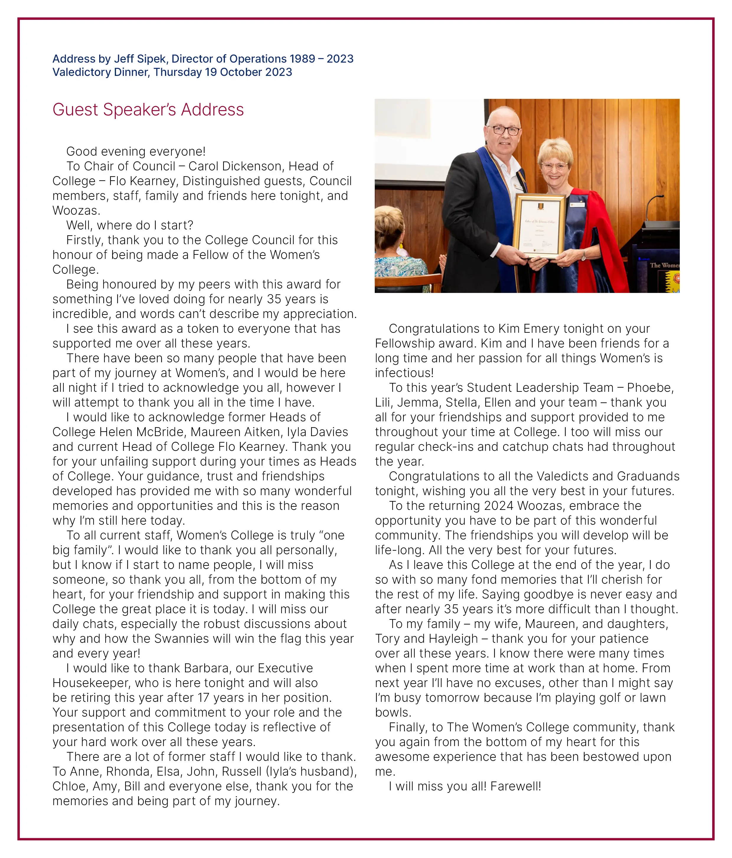 Jeff Sipek was honoured with a Fellowship at The Women’s College Valedictory Dinner on Thursday 19 October 2023 by Council President Emeritus Professor Carol Dickenson AM.