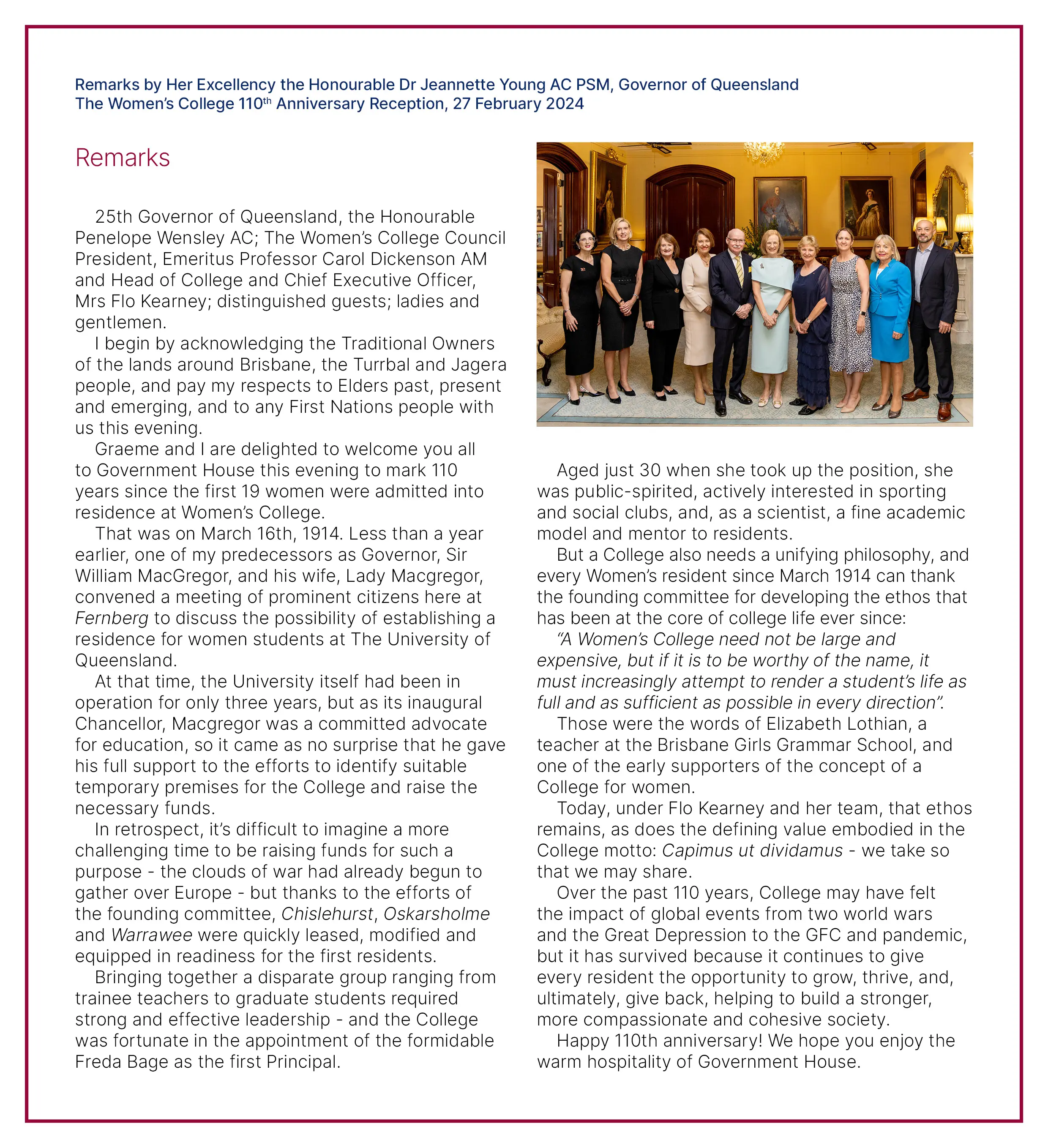 Below is the Governor of Queensland’s remarks about The Women’s College’s 110th Anniversary.