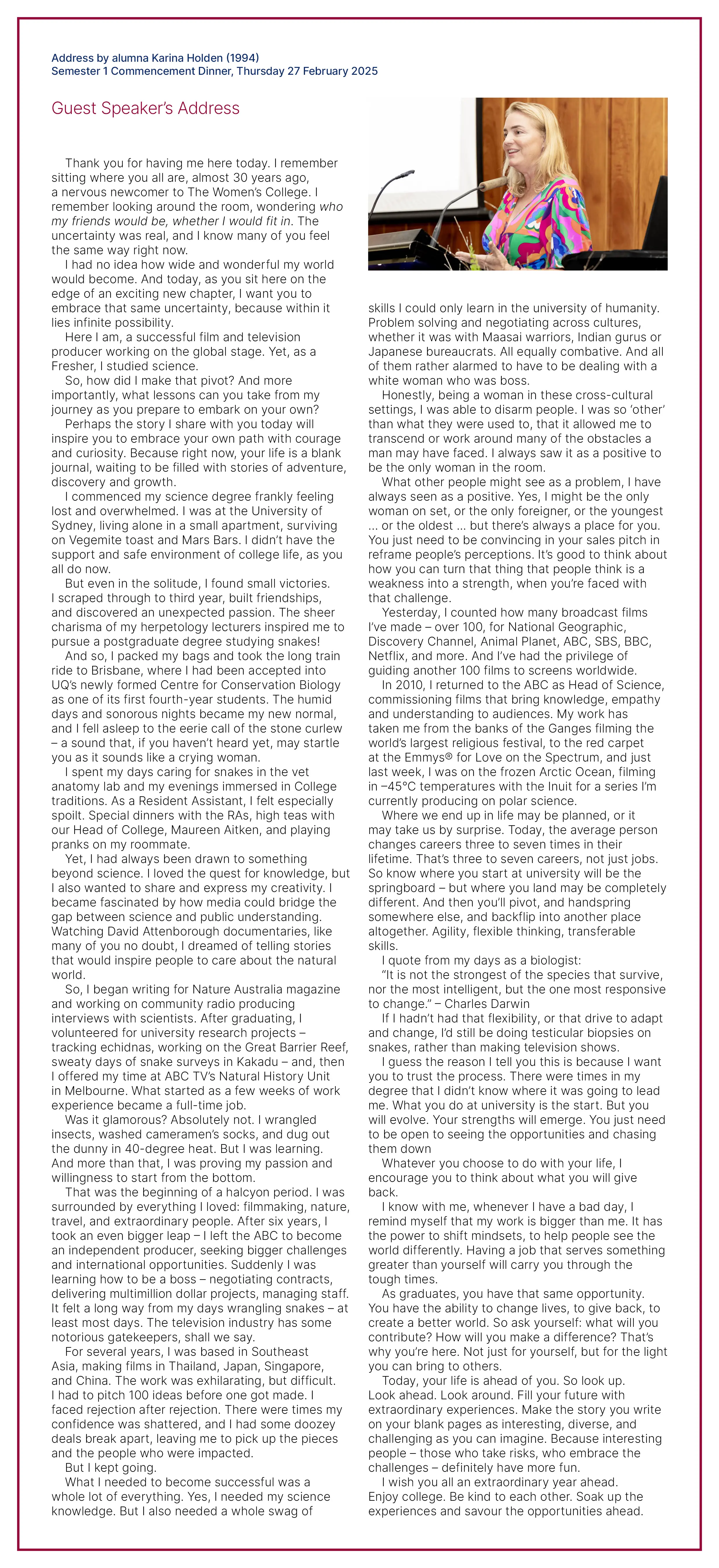 The 2025 Semester 1 Commencement Formal Dinner at The Women’s College featured distinguished alumna Karina Holden (Resident Assistant 1994) as guest speaker.