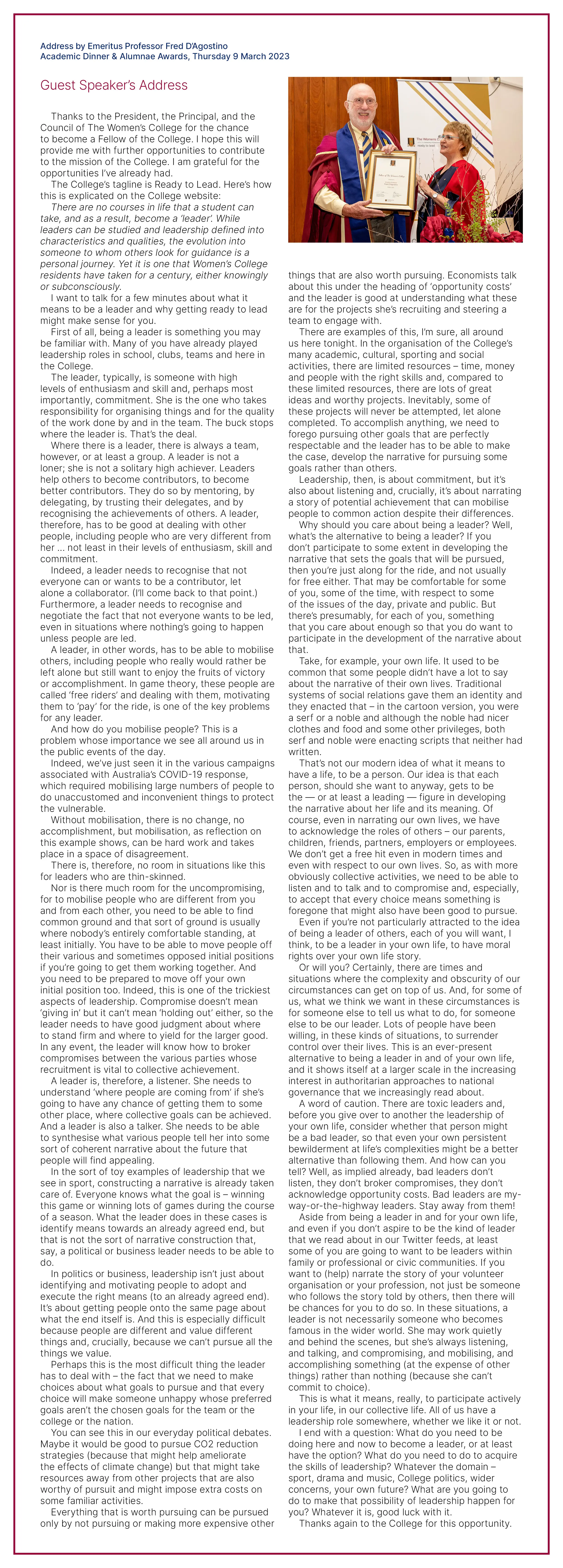 Emeritus Professor D’Agostino was also the guest speaker for the 2023 Academic Dinner & Alumnae Awards and spoke about the College’s tagline, ‘Ready to Lead’, and what it means to be a leader and why getting ready to lead makes sense for our students and alumnae.
