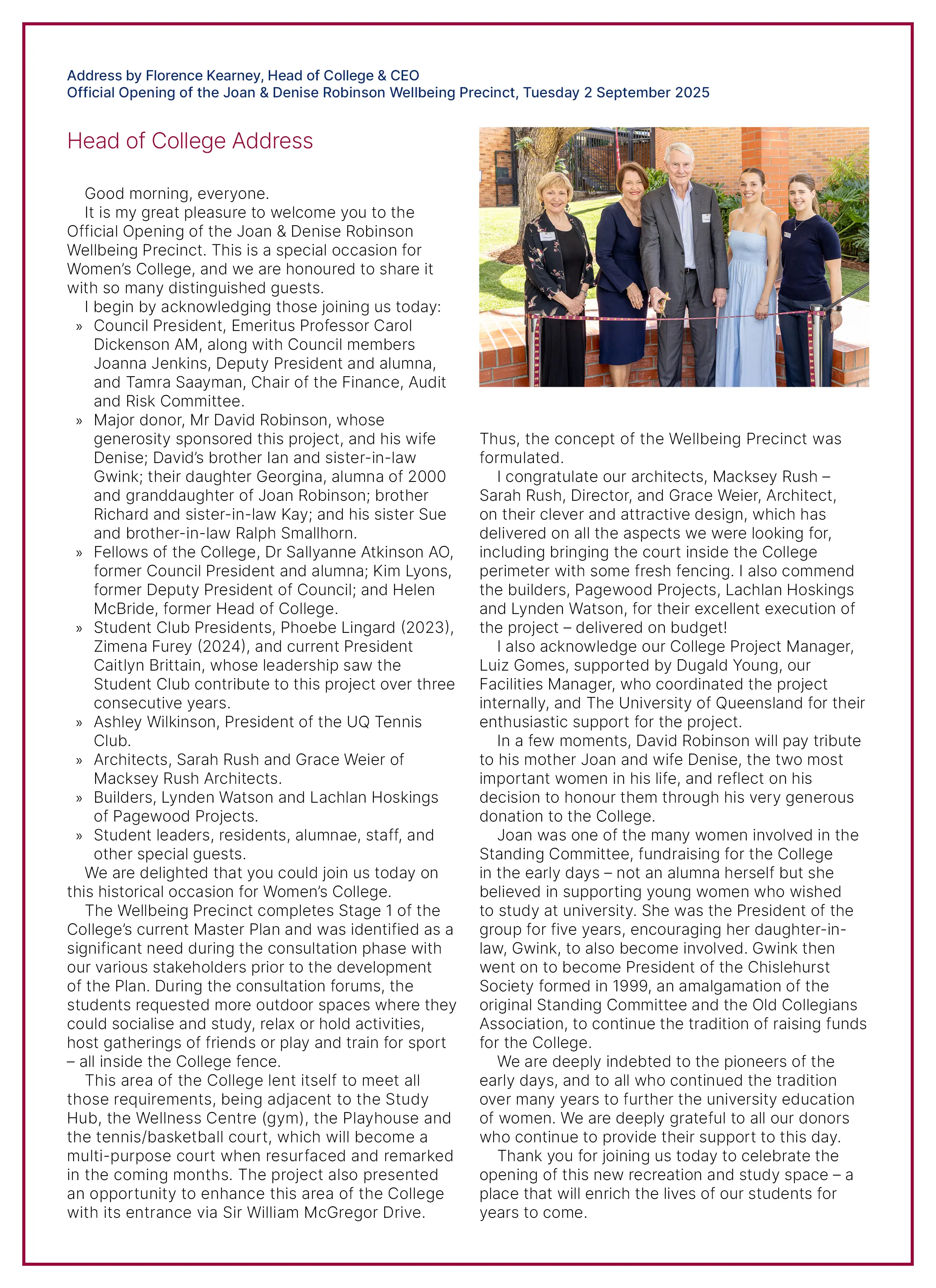 Tuesday 2 September 2025: Official Opening of the Joan & Denise Robinson Wellbeing Precinct.