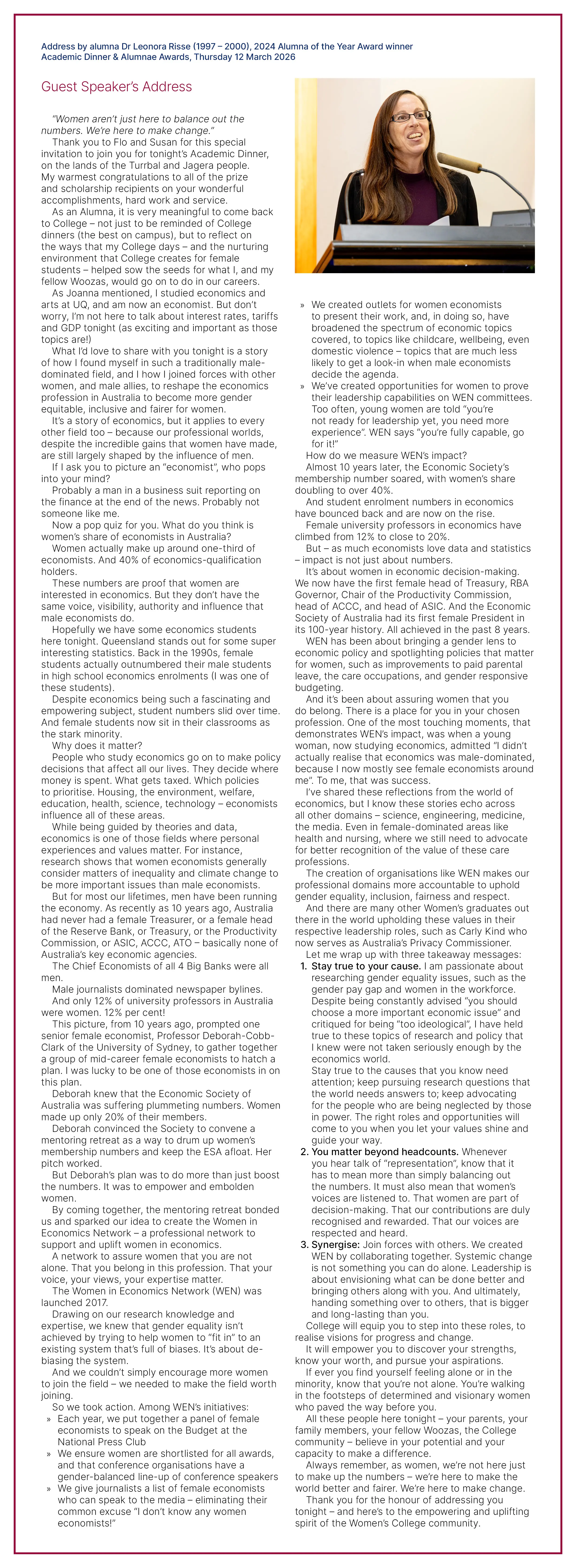 2024 Alumna of the Year Dr Leonora Risse (1997 – 2000) was the Guest Speaker at the 2026 Academic Dinner & Alumnae Awards. Leonora drew on her experience and work in economics and gender equality to deliver an inspiring address.