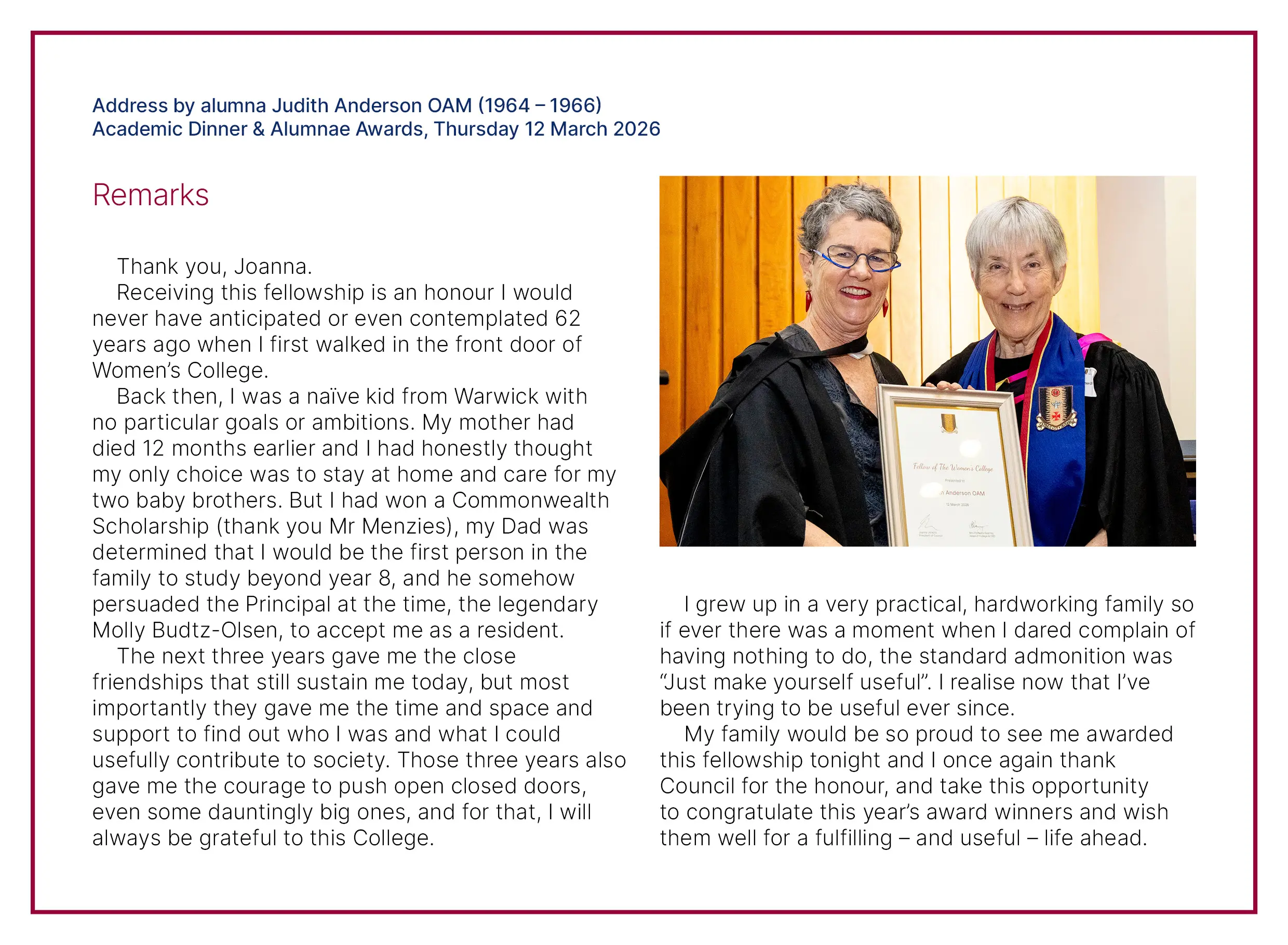 2026Fellowship Ceremony for Judith Anderson OAM
